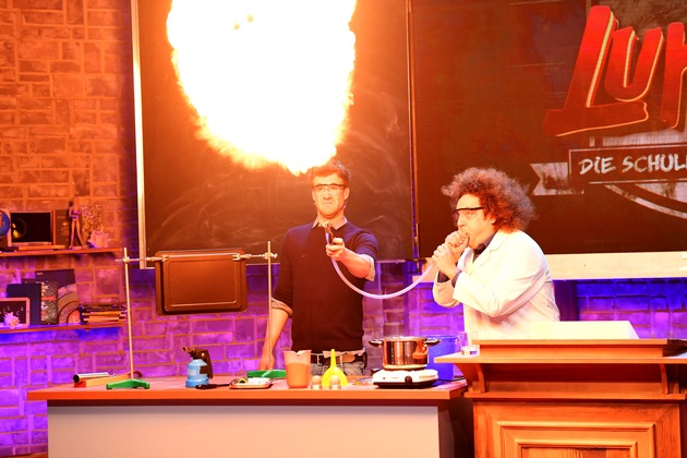 Mit Salami schweißen? Mehl explodieren lassen? Auf einem Maisstaerke-Wasser-Gemisch laufen? Fuer den richtigen Knalleffekt in Luke Mockridges neuer SAT.1-Show "LUKE! Die Schule und ich - VIPs gegen Kids" ab Freitag, 5. Mai, 20:15 Uhr, sorgt Konrad Stoeckel als "verrueckter Professor" mit seinen spektakulaeren Labor-Versuchen. "Wer sich Konrad einlaedt, der muss produktionsversicherungs-technisch eine Schippe drauflegen. Der hat es echt krachen lassen", kuendigt Luke Mockridge an. "Er hat zwar immer alles doppelt und dreifach abgesichert, aber zum Beispiel hat es ihm seinen Fingernagel bei einer Explosion abgesprengt. Den hat er sich hinter der Buehne einfach wieder mit Sekundenkleber angeklebt. Dann hat er noch eine Gluehbirne gegessen. Konrad ist schon ein harter Hund und ein verrueckter Typ - ein Gewinn fuer jede Sendung."