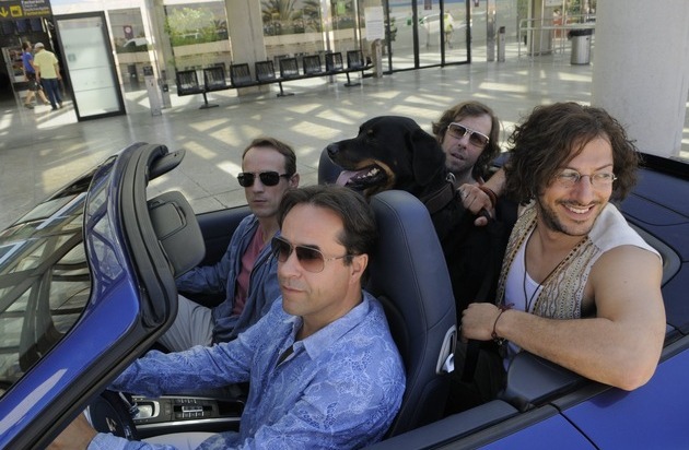 Vier Freunde müsst ihr sein: Wotan Wilke Möhring, Jan Josef Liefers, Fahri Yardim und Oliver Korittke in "Da muss Mann durch" am 30. Mai in SAT.1