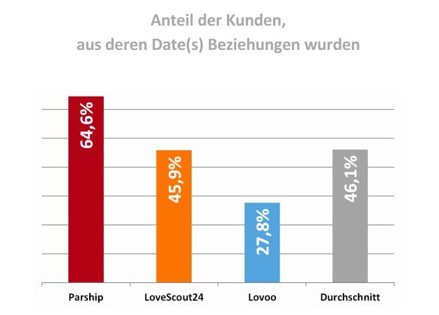 Als echter Verkupplungskünstler entpuppte sich Parship mit 35% Vermittlungsquote. Das entspricht immerhin dem Slogan "Alle 12 Minuten verliebt sich ein Single bei Parship", statt der bekannten 11 Minuten.