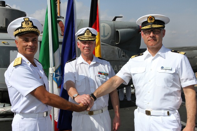 Auf dem Flugdeck der italienischen Fregatte "Carabiniere" hat der italienische Ehrenzug Aufstellung genommen - traditionell mit Karabiner, Säbel und Gamaschen. Unter den Gästen zur Übernahme der Verbandsführung durch den deutschen Flottillenadmiral Jan C. Kaack befanden sich der Parlamentarische Staatssekretär Markus Grübel, die Botschafter der EU und Deutschlands sowie der Befehlshaber des Einsatzführungskommando der Bundeswehr, Generalleutnant Erich Pfeffer. Die Deutsche Marine wurde vertreten durch den Abteilungsleiter Einsatz im Marinekommando, Konteradmiral Jean Martens.