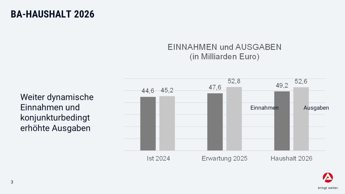 Nach Abrechnung mit den umlagefinanzierten Leistungen für Insolvenzgeld- und Winterbeschäftigung wird die BA das in 2026 entstehende Defizit von 3,97 Mrd. Euro durch Darlehen (Liquiditätshilfen) des Bundes ausgleichen. Für das laufende Jahr 2025 kalkuliert die BA mit einem Minus in Höhe von bis zu 5,23 Mrd. Euro, das durch den vollständigen Einsatz der Rücklage in Höhe von 3,2 Mrd. Euro und Darlehen des Bundes in Höhe von bis zu 2,2 Mrd. Euro ausgeglichen wird.