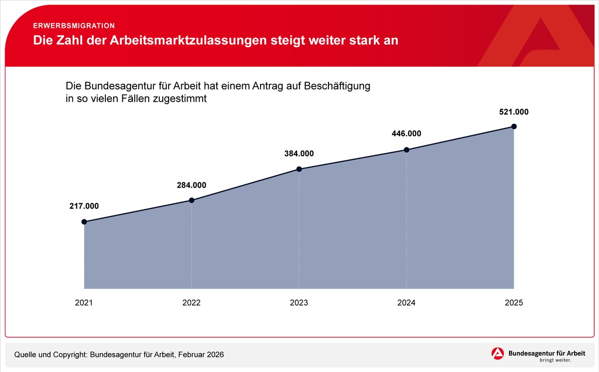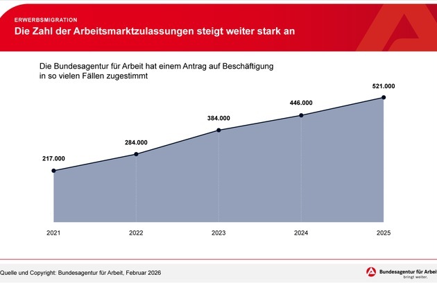 Um 140 Prozent ist die Zahl der von der Bundesagentur für Arbeit erteilten Arbeitsmarktzulassungen seit 2021 gestiegen - auf gut 521.000 im Jahr 2025. Das ist auch gegenüber dem Vorjahr ein deutliches Plus von 17 Prozent.