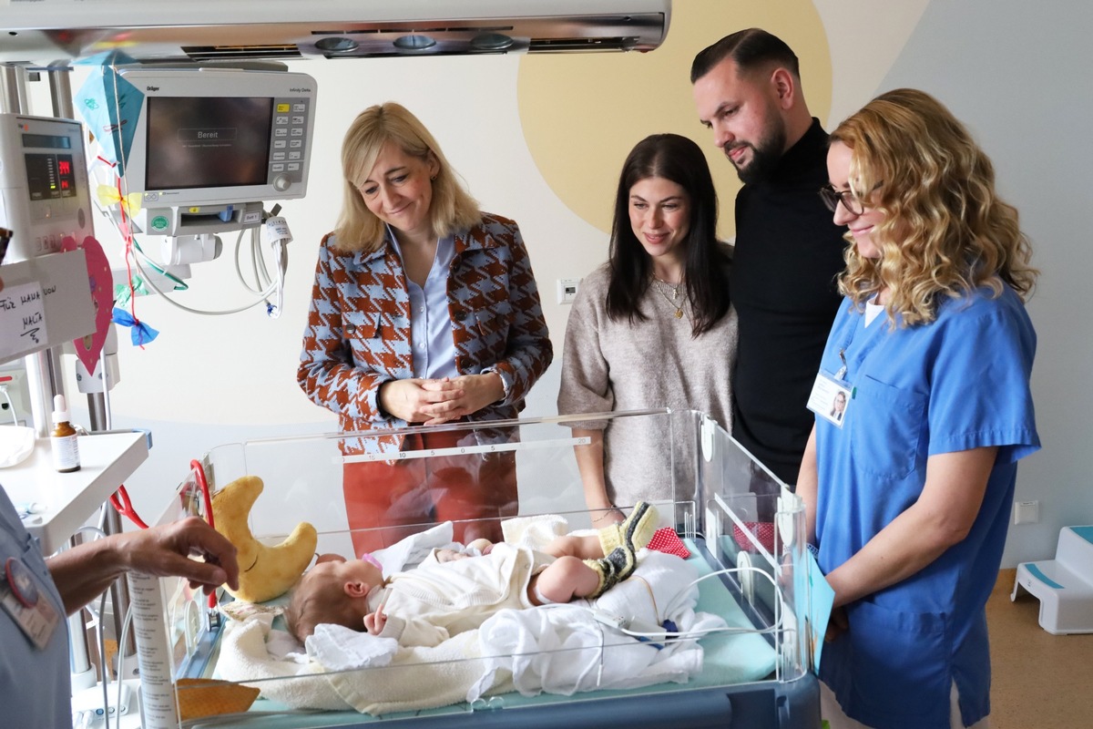 Nach dem intensiven Austausch nahm sich Bundesgesundheitsministerin Nina Warken Zeit für einen Rundgang durch die Klinik für Kinder- und Jugendmedizin. Das Caritas-Krankenhaus investierte in diesem Jahr besonders auf der Station für Kinderintensivmedizin in innovative medizinische Ausstattung: Die Station verfügt über hochsensible Beatmungsgeräte für Säuglinge, spezielle Monitorsysteme und einen mobilen Transportinkubator, der eine sichere Verlegung von Früh- und Neugeborenen ermöglicht. Die Klinik für Kinder- und Jugendmedizin unterstützt außerdem die reguläre Notfallversorgung bei Notfalleinsätzen: Bei einem Einsatz zwischen 08:00 und 16:00 fährt eine erfahrene Kinderärztin oder ein Kinderarzt des Caritas-Krankenhauses zusätzlich zu den Sanitäter*innen mit hinaus und das in einem Radius von Wertheim über Buchen bis nach Künzelsau, um eine kindgerechte, hochqualifizierte Erstversorgung direkt am Einsatzort sicherzustellen – insbesondere bei lebensbedrohlichen Zuständen bei Säuglingen, Kleinkindern oder Jugendlichen.