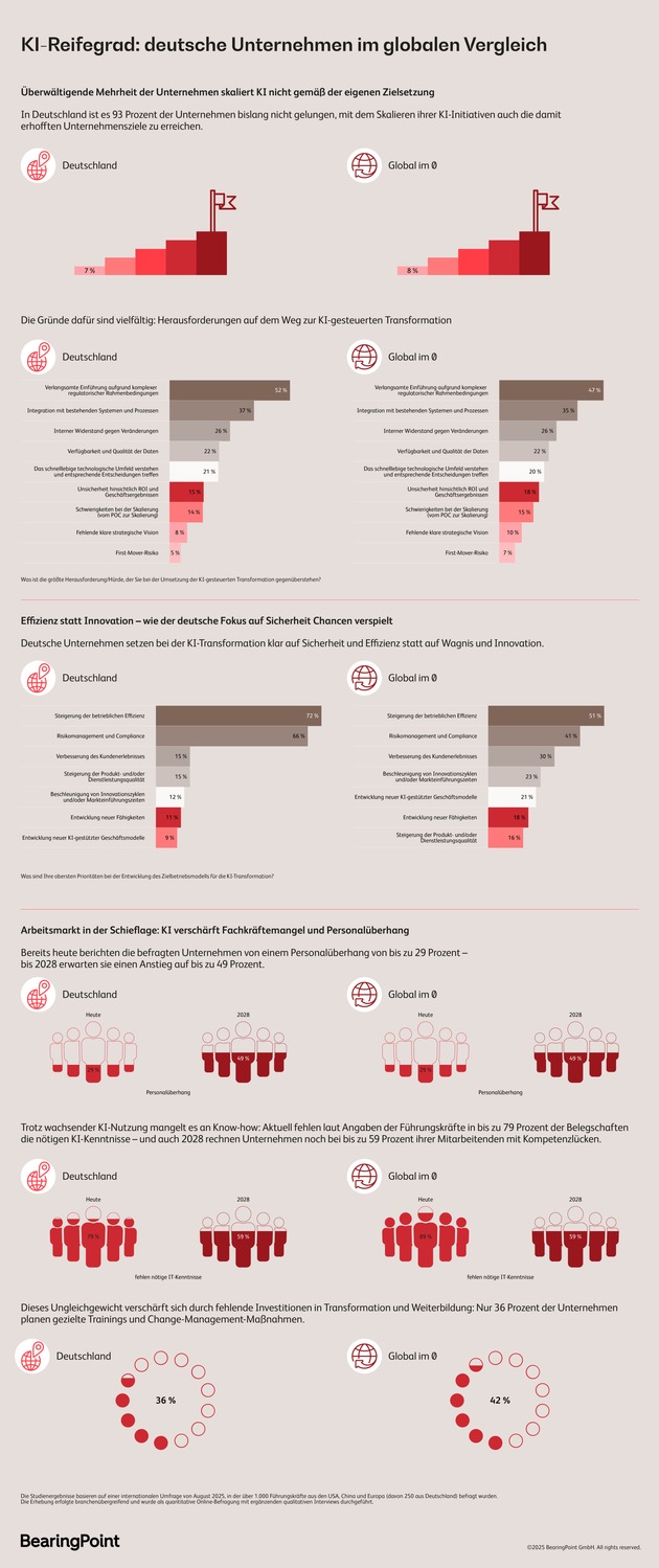 "Deutschland bleibt bei der Skalierung von KI-Projekten hinter den selbst gesteckten Zielen zurück - interne Widerstände, regulatorische Hürden sowie veraltete IT-Landschaften bremsen die Umsetzung. Wer jetzt nicht handelt, riskiert die eigene Wettbewerbsfähigkeit und Zukunftsfähigkeit zu verlieren", kommentiert Juliane Musil, Partnerin bei BearingPoint.