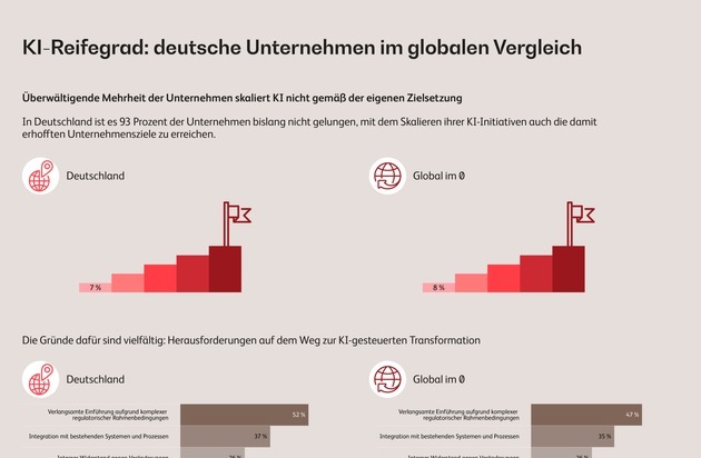 In Deutschland ist es 93 Prozent der Unternehmen bislang nicht gelungen, mit dem Skalieren ihrer KI-Initiativen auch die damit erhofften Unternehmensziele zu erreichen. Die Mehrheit der Unternehmen in Deutschland bleibt in der Pilotphase oder skaliert nicht wie geplant. Die Gründe sind laut der Befragung vielfältig: