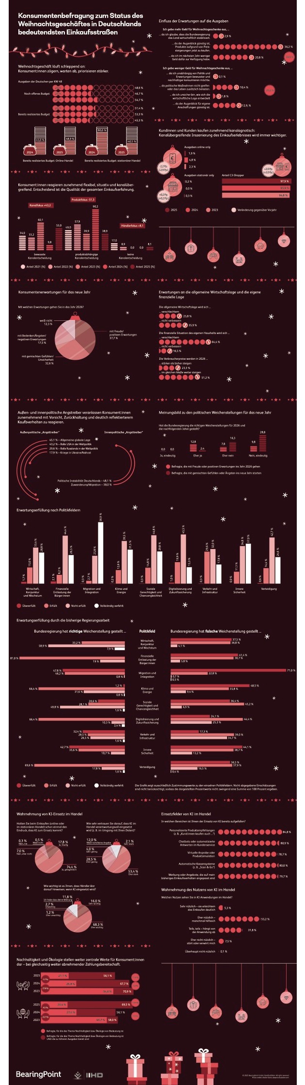 Die Management- und Technologieberatung BearingPoint präsentiert die Ergebnisse der diesjährigen Studie zum Weihnachtsgeschäft in Zusammenarbeit mit dem IIHD Institut. Die Analyse zeigt: Das Fest steht 2025 unter dem Einfluss politischer Unsicherheit, wirtschaftlicher Vorsicht und eines zunehmend rationalen Konsumverhaltens. Trotz dieser Herausforderungen bleibt das Weihnachtsbudget auf einem guten Niveau, während sich Einkaufsprozesse und Erwartungen an Händler weiter verändern.
