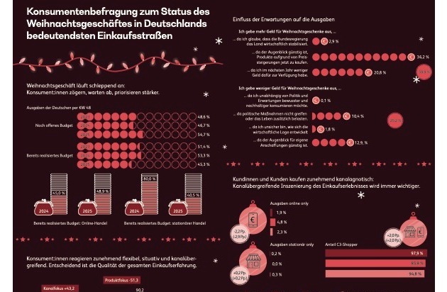 Das Weihnachtsgeschäft startet schleppend: Die Frequenzen in vielen Innenstädten bleiben verhalten. Zahlreiche Standorte liegen - teilweise deutlich - unter dem Vorjahresniveau. Während Städte wie Hamburg, Bonn, Essen und Wiesbaden mit Rückgängen von bis zu 15 Prozent besonders betroffen sind, verzeichnen Düsseldorf, Nürnberg, Leipzig und Saarbrücken leichte Zugewinne von bis zu 10 Prozent im Vergleich zu 2024. "Das Gesamtbild deutet eher auf einen holprigen Start als auf einen Ansturm hin, doch es ergibt sich ein Hoffnungsschimmer: Mit durchschnittlich 539 Euro bleibt das Weihnachtsbudget auf einem guten Niveau, auch wenn es knapp fünf Prozent unter dem Vorjahr liegt", so Prof. Dr. Jörg Funder, Direktor des IIHD Instiuts. Der Wunsch nach einem "normalen Weihnachten" scheint ein emotionaler Gegengewichtfaktor zu rationalen Zukunftssorgen zu sein, der Ausgaben stabilisiert.