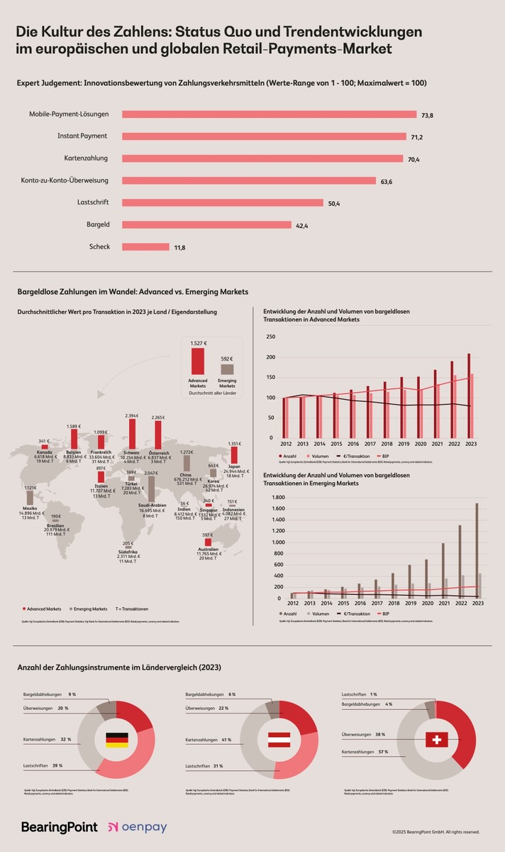 Die Retail-Payments-Market Studie 2025 wurde in Zusammenarbeit von BearingPoint und OeNPAY erstellt. Sie basiert auf umfangreichen Daten der Europäischen Zentralbank (EZB), der Bank for International Settlements (BIS) sowie einer repräsentativen Verbraucherumfrage in neun europäischen Ländern. Die Studie liefert einen Überblick über die genutzten Zahlungsinstrumente in verschiedenen Märkten sowie detaillierte Länderreports für Österreich, Deutschland und die Schweiz und gibt einen Ausblick auf die Zukunft des Zahlungsverkehrs.
