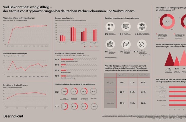 "Unsere aktuelle Studie zeigt, dass Kryptowährungen in Deutschland zwar eine hohe Bekanntheit genießen, die tatsächliche Nutzung aber weiterhin gering bleibt. Die Menschen vertrauen beim Bezahlen und beim Werterhalt nach wie vor auf staatliche Währungen und Gold. Bemerkenswert ist, dass digitale Zentralbankwährungen auf eine echte Marktlücke stoßen und von den Befragten als vielversprechende Alternative wahrgenommen werden. Private digitale Währungen wie Stablecoins oder Tokenized Deposits können diese Lücke bislang nicht schließen. Die Ergebnisse zeigen: Kryptowährungen sind in Deutschland angekommen und sie haben sich als eine Art digitales Gold etabliert, aber der Sprung zum Massenzahlungsmittel bleibt aus. Digitale Zentralbankwährungen haben hingegen eine signifikante Chance, diese Funktion auszufüllen", resümiert Dr. Robert Bosch, Partner und Globaler Leiter Banking & Capital Markets bei BearingPoint.