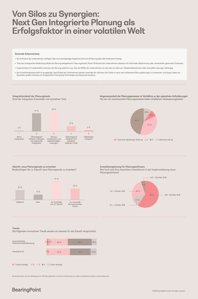 "Die Schließung von Integrationslücken, die konsequente Verankerung von Best Practices und Investitionen in moderne Planungsplattformen ermöglichen es Unternehmen, sich von einer reaktiven und fragmentierten Planung hin zu einem resilienten, integrierten Planungsmodell zu entwickeln, das strategischen Mehrwert sowie auch signifikante finanzielle Vorteile liefert. Denn wir sehen immer mehr, dass eine optimierte Planung bei Geschäftstransformationen einen der Bereiche mit dem größten Wertbeitrag darstellt", resümiert Dr. Frank Tiefenbeck, Partner bei BearingPoint.