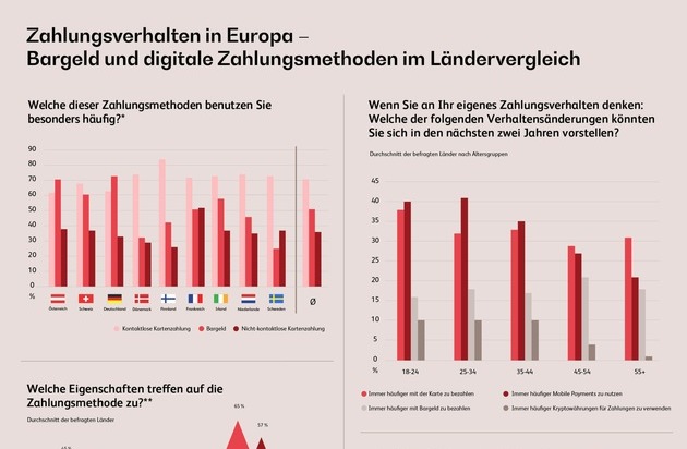Kontaktlose Kartenzahlung dominieren europaweit im Durchschnitt: In allen untersuchten Ländern bis auf Deutschland und Österreich sind kontaktlose Kartenzahlungen deutlicher Spitzenreiter. Der Abstand der durchschnittlichen Nutzung von kontaktloser Kartenzahlung ist mit 71 % gegenüber dem Bargeld mit 51 % sehr ausgeprägt. Spitzenreiter bei der Häufigkeit der Nutzung der kontaktlosen Kartenzahlung ist Finnland mit 84 % gefolgt von den Niederlanden und Dänemark mit 74 %, Irland und Schweden mit 73 % sowie Frankreich mit 72 %. Schlusslichter sind hier die deutschsprachigen Länder Schweiz (68 %), Deutschland (63 %) und Österreich (62 %).