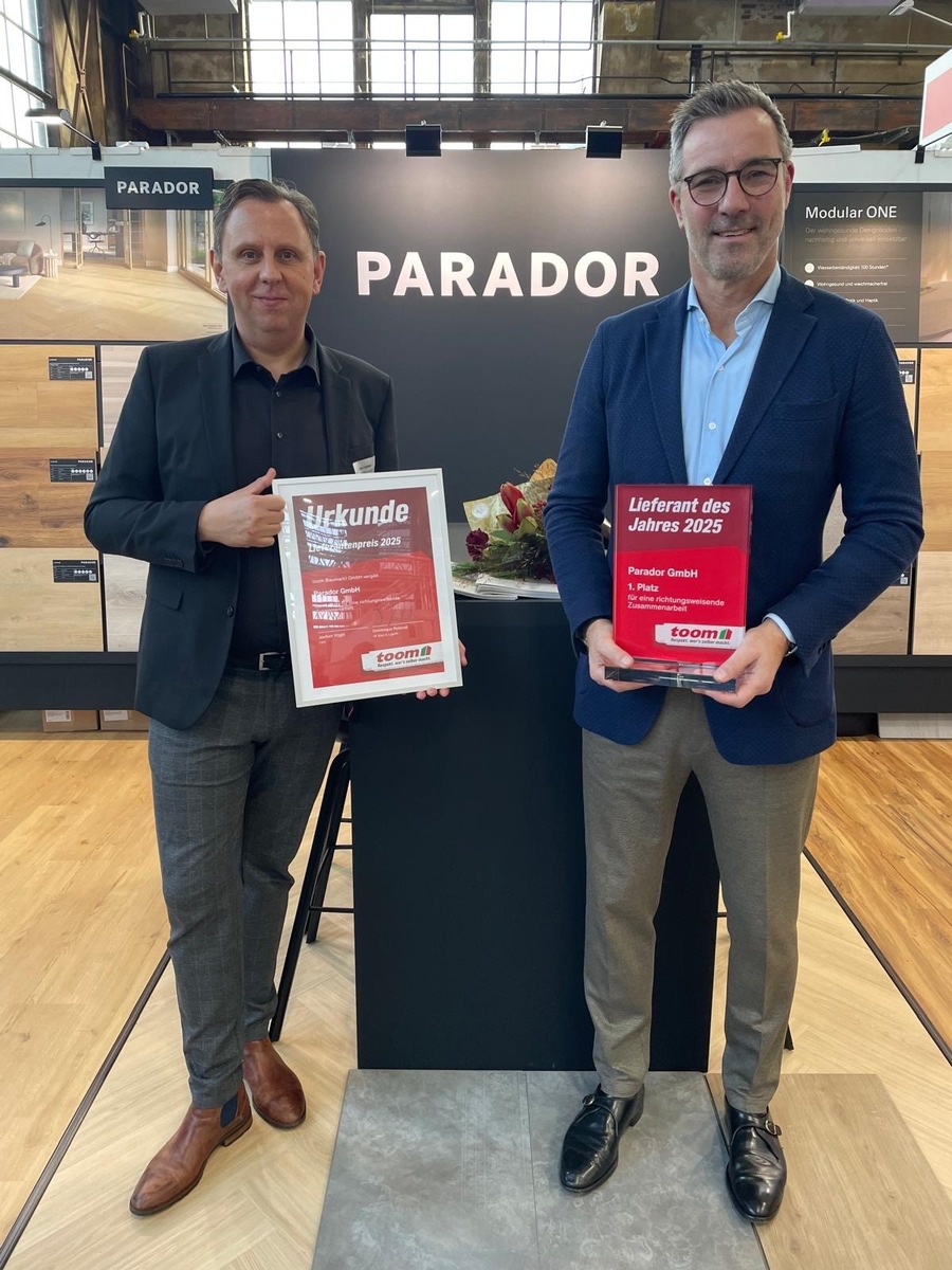 Coesfeld, im Dezember 2025. Parador wurde auf der diesjährigen Hausmesse von Toom mit dem Titel „Lieferant des Jahres 2025“ geehrt. Die Auszeichnung würdigt eine besonders vertrauensvolle und richtungsweisende Zusammenarbeit sowie Paradors konsequente Ausrichtung auf Qualität, Service und partnerschaftliches Wachstum. Der Preis wurde von Dirk Boll, Director Sales EMEA, und Dierk Engleder, Head of Sales DIY, entgegengenommen.