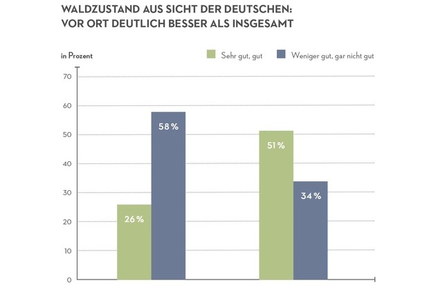 Auf die Frage nach dem Zustand der Wälder in Deutschland ganz allgemein bewerten lediglich 26 Prozent den Zustand als "sehr gut" oder "gut". Demgegenüber stehen 58 Prozent, die den Zustand als "weniger gut" oder "gar nicht gut" einschätzen. Ganz anders fällt das Urteil aus, wenn die Menschen an den Wald "bei sich in der Gegend" denken: Hier bescheinigen 51 Prozent dem Wald einen "sehr guten" oder "guten" Zustand. Nur 34 Prozent bewerten ihn als "weniger gut" oder "gar nicht gut". Damit ist die positive Bewertung des eigenen Nahwaldes nahezu doppelt so hoch wie die des Waldes in Deutschland insgesamt.