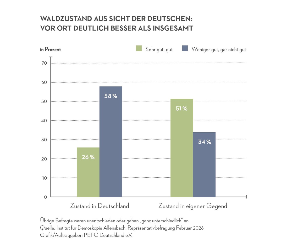 Zum Tag des Waldes am 21. März 2026 zeigen aktuelle Ergebnisse einer repräsentativen Bevölkerungsbefragung in Deutschland: Die Menschen blicken mit Sorge auf den allgemeinen Zustand der Wälder im Land - bewerten jedoch den Wald in ihrer unmittelbaren Umgebung deutlich besser. Die Studie wurde vom Institut für Demoskopie Allensbach im Auftrag von PEFC Deutschland im Februar 2026 durchgeführt. Befragt wurden 1.052 Personen ab 16 Jahren.