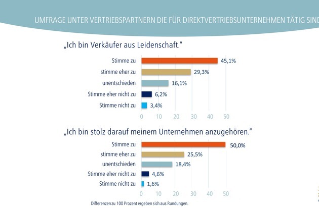 Demnach beschreiben sich Dreiviertel der befragten Verkaufsberater als Verkäufer aus Leidenschaft und stimmen der Aussage zu, stolz darauf zu sein, ihrem Unternehmen anzugehören. "Direktvertriebsunternehmen fördern mit Schulungen und Team-Aktionen das Gefühl der Zusammengehörigkeit und das Verkaufstalent ihrer Partner. Nur wer seine Tätigkeit mit Leidenschaft ausübt, kann erfolgreich sein", erklärt Jochen Acker, Vorstandsvorsitzender des BDD.