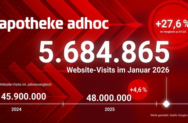 APOTHEKE ADHOC steigert seine Reichweite erneut: Mit rund 48 Millionen Visits baut das unabhängige Nachrichtenportal für Pharma und Apotheke seine Marktposition weiter aus. 5,7 Millionen Visits im Januar 2026 bedeuten ein Plus von knapp 28 Prozent zum Jahresstart: APOTHEKE ADHOC ist und bleibt eine Instanz für alle Themen rund um Apotheke, Pharma und Arzneimittel.