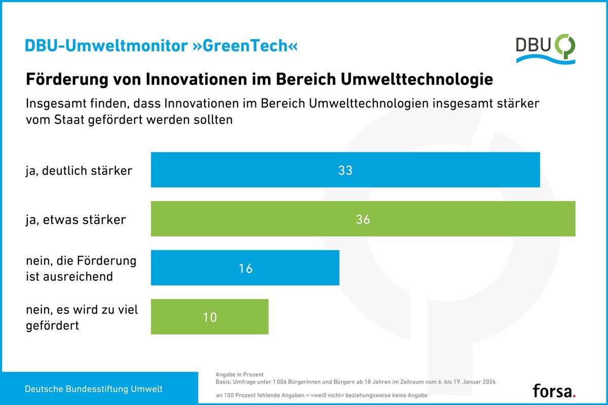 Es mangele nicht an klugen Köpfen, so Bonde. „Das zeigen die jedes Jahr von der DBU hundertfach geförderten Projekte mittelständischer Unternehmen und Startups.“ GreenTech, die Kurzform für Green Technology (grüne Technologie), mache „die Wirtschaft wettbewerbsfähig“, sagt der DBU-Generalsekretär. Dem 2025 vorgelegten GreenTech-Atlas zufolge vereint die Branche mit grünen Technologien auf Grundlage umweltfreundlicher Produktentwicklungen und Firmenstrategien die Bereiche Umwelt, Technik, Wissenschaft und Wirtschaft. Der GreenTech-Atlas unterscheidet sieben sogenannte „Leitmärkte“, darunter Circular Economy (eine umfassende Kreislaufwirtschaft), Energieeffizienz und umweltfreundliche Mobilität. Die forsa-Umfrage vom 6. bis 19. Januar dieses Jahres zu GreenTech sollte unter anderem herausfinden, wie die Menschen in Deutschland auf umweltfreundliche Technologien und damit verbundene Industrien schauen. Abgefragt wurden ebenfalls Meinungen zur Rolle des Staates etwa bei Förderungen sowie Präferenzen beim Konsum umweltfreundlicher Waren. Die forsa-Ergebnisse können wie bei ähnlichen Stichprobenerhebungen mit üblicher Fehlertoleranz (in diesem Fall plus/minus drei Prozentpunkte) auf die Gesamtheit der Bevölkerung ab 18 Jahren in Deutschland übertragen werden.