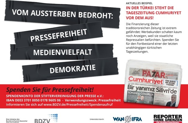 Als ein Signal der Solidarität zum 3. Mai für Pressefreiheit, Medienvielfalt und Demokratie schaltet der BDZV mit Unterstützung von WAN-IFRA (Weltverband der Zeitungen und Nachrichtenmedien) und Reporter ohne Grenzen deshalb den gesamten Mai hindurch Spendenanzeigen in den deutschen Zeitungen.