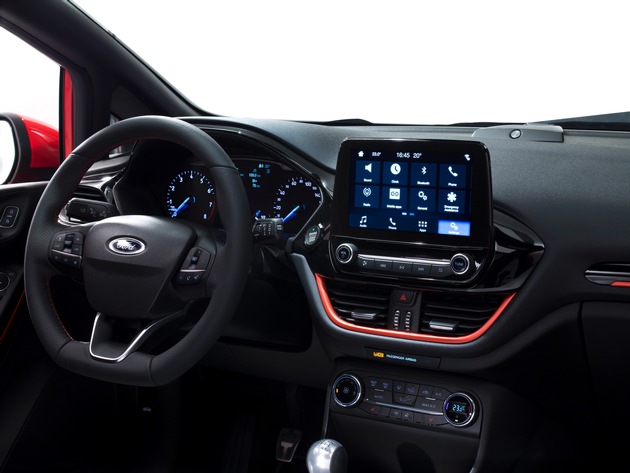 Der acht Zoll große, einem Tablet ähnelnde Touchscreen bestimmt das neue, nochmals ergonomischer gestaltete Interieur-Design. Er lässt sich auch mit Wischbewegungen bedienen. Hinzu kommen ein weiterer 6,5-Zoll-Touchscreen und ein 4,2 Zoll großer Farbmonitor, der mit dem MyFord Dock verbunden ist. Über dieses System können elektronische Geräte wie Smartphones oder tragbare Navis sicher gelagert, eingebunden und aufgeladen werden. Alle Bildschirme des neuen Fiesta zeichnen sich durch klassenbeste Auflösung und eine Lichtstärke aus, die vergleichbare Displays anderer Kleinwagen um bis zu 100 Prozent übertreffen. Positiver Effekt: Der Fahrer kann Informationen leichter erfassen und Funktionen innerhalb der Menü-Struktur noch zielgenauer bedienen.