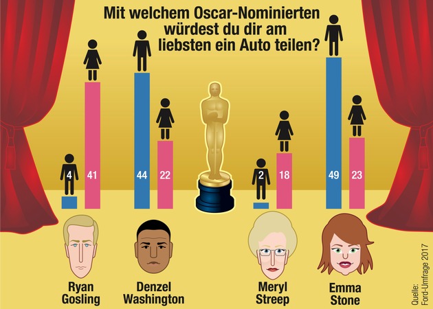 Doch mit welchem Promi würden die Millennials gerne gemeinsam im Auto sitzen? Bei den befragten 18- bis 34-jährigen Frauen schlägt das Herz ganz klar für Ryan Gosling: 41 Prozent würden das Auto am liebsten mit dem Oscar-Favoriten teilen, der in "Drive" (2012) nicht nur als Stuntman sondern auch als Fluchtfahrer zeigt, dass er Autofahren kann. 49 Prozent der befragten Männer würden sich gerne eine Fahrgelegenheit mit La La Land Darstellerin Emma Stone teilen. Doch auch Denzel Washington ist als Mitfahrer bei den männlichen Millennials beliebt: Fast ein Drittel der Befragten würden gerne gemeinsam mit dem Schauspieler zum roten Teppich fahren. Die Oscar-Date Verliererin des Abends ist Meryl Streep. Nur rund 10 Prozent möchten mit der Schauspielerin, die bereits zum zwanzigsten Mal nominiert ist, zum roten Teppich fahren.
