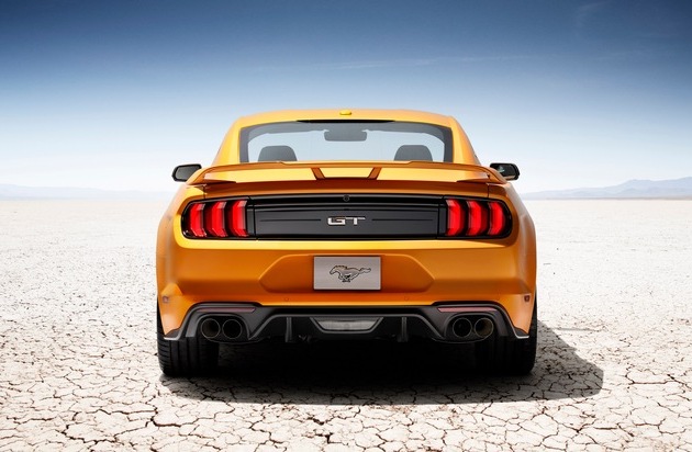 Zugleich wirkt die Heckpartie des neuen Ford Mustang durch neu modellierte Stoßfänger- und Diffusor-Elemente noch markanter. Dies gilt insbesondere für den "GT", also für die V8-Version mit dem 5,0 Liter großen Motor, die nun serienmäßig eine Abgasanlage mit vier Endrohren erhält und keinen Zweifel an der Leistungsfähigkeit der Top-Version aufkommen lässt. Optional bietet Ford zudem einen Heckspoiler an, der das sportliche Erscheinungsbild des Hecktrieblers zusätzlich unterstreicht.