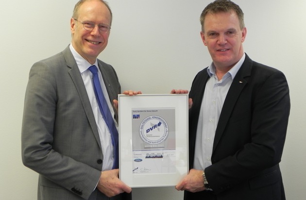 - Nächste Sicherheitstrainings für Herbst 2018 geplantDer Deutsche Verkehrssicherheitsrat (DVR) hat das Ford Fahrsicherheitstraining "Vorfahrt für Deine Zukunft" heute in Berlin mit dem Qualitätssiegel des Deutschen Verkehrssicherheitsrates für Verkehrssicherheitstrainings (PKW) ausgezeichnet. DVR Hauptgeschäftsführer Christian Kellner übergab in einer offiziellen Feierstunde die Urkunde an Olaf Hansen, Leiter Kommunikation Ford-Werke GmbH.