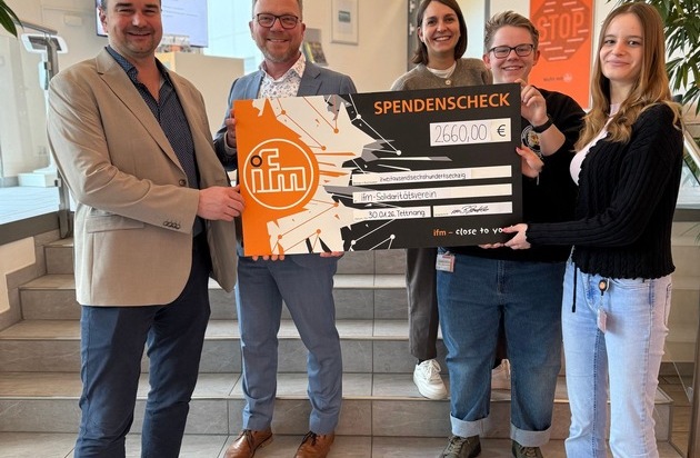 Der ifm-Solidaritätsverein wurde ins Leben gerufen, um Mitarbeitende der ifm-Gesellschaften in schwierigen Situationen zu unterstützen. Der Verein setzt sich unabhängig vom Unternehmen für organisatorische, menschliche und finanzielle Hilfe ein. Hierbei wird eng mit der AWO zusammengearbeitet, um professionelle, ganzheitliche und auch anonyme Unterstützung in allen Lebensbereichen sicherzustellen. Die Vertreter der Organisation, die in diesem Jahr durch eine Spende unterstützt wurden, freuten sich bei der Übergabe der symbolischen Schecks über die Summe von jeweils 2.660 Euro.