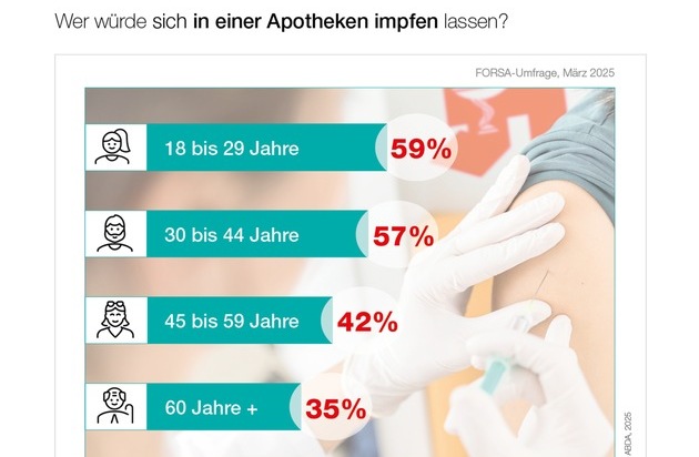 In der Impfsaison 2024/2025 ließen sich rund 122.000 Menschen in Apotheken gegen Grippe und rund 80.000 Menschen gegen das Coronavirus impfen - und damit deutlich mehr als je zuvor. Eine von der ABDA in Auftrag gegebene, repräsentative forsa-Umfrage aus dem Frühjahr 2025 zeigt, dass sich die Impfquote durch Apotheken-Impfungen noch weiter steigern ließe: Denn viele Bundesbürgerinnen und Bundesbürger, vor allem Jüngere, würden sich in Zukunft gerne in Apotheken impfen lassen. 46 Prozent der Befragten können sich demnach vorstellen, sich in einer Apotheke impfen zu lassen. Bei den Erwachsenen unter 30 Jahren sind es sogar 59 Prozent. Rund ein Drittel aller Befragten gab an, dass die Apotheken ihr Impfangebot ausbauen und auch andere Impfungen anbieten sollten. Insgesamt wurden 3.441 Erwachsene im März 2025 befragt.