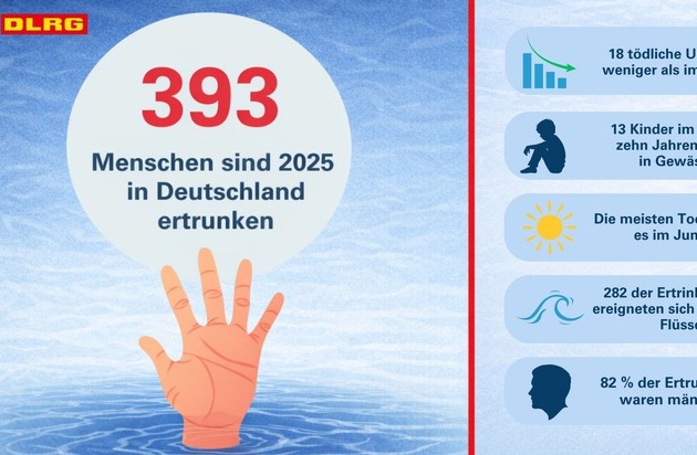 Alle Informationen zur DLRG Statistik "Todesfälle durch Ertrinken 2025" gibt es im Internet unter dlrg.de/statistik-ertrinken. Grafiken sowie O-Töne für Audio- und Videoformate stehen im DLRG Medienportal zum Download bereit.