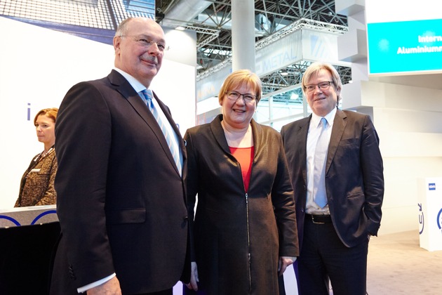 Der globale Megatrend Leichtbau bietet dem Werkstoff Aluminium hervorragende Wachstumschancen - vor allem im Automobilbau, der Luftfahrtindustrie und im Bausektor. Davon überzeugte sich Iris Gleicke, MdB und Parlamentarische Staatssekretärin beim Bundesminister für Wirtschaft und Energie, bei ihrem Besuch auf der ALUMINIUM 2016 in Düsseldorf, der weltweit größten Branchenveranstaltung der Aluminiumindustrie. Begleitet wurde Iris Gleicke auf ihrem Messerundgang von Dr. Hinrich Mählmann, Präsident des GDA Gesamtverband der Aluminiumindustrie, Düsseldorf, und Christian Wellner, Geschäftsführendes Präsidialmitglied des GDA. Sie stellten Iris Gleicke zukunftsweisende Anwendungen und innovative Technologien der Aluminiumindustrie vor. Sie besuchte u.a. die SAPA Group, Weltmarktführer in der Produktion von Aluminium-Strangpressprofilen und die Erbslöh Aluminium GmbH, die mit ihren Aluminiumprodukten weltweiter Lieferant für alle wichtigen Automobilhersteller ist.