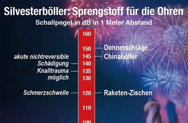 Zum Jahreswechsel soll das Feuerwerk mit Lärm und Krach böse Geister vertreiben. Bei der Knallerei wird jedoch oft vergessen, dass sie unser Gehör beträchtlich schädigen kann. Mehr als 8.000 Menschen sind jährlich nach Silvester von Verletzungen des Innenohrs durch den Knall von Böllern und Raketen betroffen. Bei rund einem Drittel von ihnen ist der Hörschaden irreparabel.