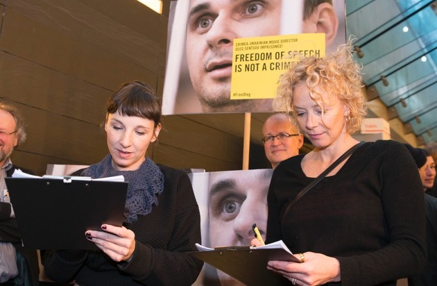 Die Schauspielerinnen Meret Becker und Katja Riemann forderten am Sonntag bei einer gemeinsamen Aktion von Amnesty International und der Deutschen Filmakademie sowie der European Film Academy die Freilassung des krim-ukrainischen Filmregisseurs Oleg Sentsov.