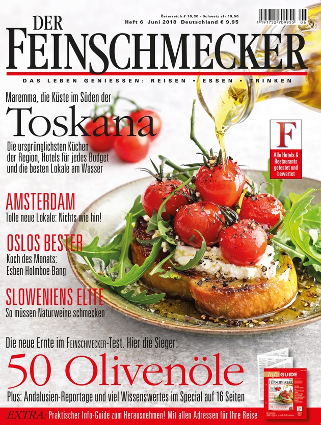 Auf 16 Seiten veröffentlicht DER FEINSCHMECKER jetzt die besten 50 Olivenöle des neuen Jahrgangs 2017/18 - weitere 200 hervorragende Olivenöle werden ab Juni auf der Webseite www.olivenoeltest.de mit ihren Bezugsquellen in Deutschland präsentiert.