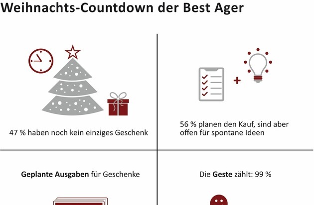 Mitten im Weihnachtstrubel sind sich die Best Ager einig: Bei Geschenken kommt es nicht auf den Preis oder die Marke an. Es ist die Wertschätzung, die zählt (99 %). Und 71 Prozent behalten ein Geschenk auch dann, wenn es ihnen nicht gefällt - nur 20 Prozent würden es im Geschäft umtauschen.