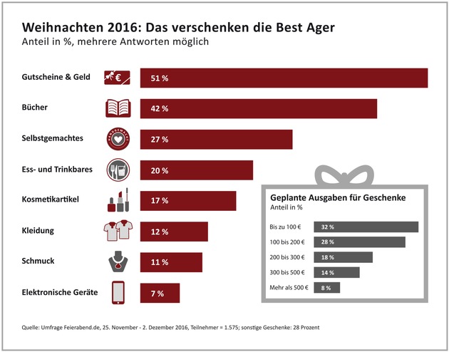 Die Generation 50plus geht beim Geschenkekauf auf Nummer sicher: Gutscheine oder Geld belegen Platz 1 der beliebtesten Gaben (51 %), danach folgen Bücher (42 %) und Selbstgemachtes (27 %). Das belegt eine Umfrage von Feierabend.de, der bekanntesten Senioren-Community im deutschsprachigen Internet. Die Befragten schätzen kreative Geschenke. Neben individuellen Fotobüchern, Selbstgenähtem oder handgefertigten Spezialitäten dürfen daher auch liebevoll ausgesuchte Leckereien nicht fehlen. Ess- und Trinkbares wie Pralinen oder Wein stehen für rund 20 Prozent ganz oben auf der Geschenkeliste. Beliebte Klassiker sind Kosmetikartikel (17 %), Kleidung (12 %) und Schmuck (11 %). Den letzten Platz des Rankings belegen Smartphone und Co. Sieben Prozent der Befragten geben an, am liebsten elektronische Geräte zu verschenken.