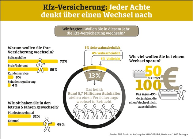 Rund 5,7 Millionen Autohalter schließen einen Versicherungswechsel zum Jahresende nicht aus. 89 Prozent der Befragten, die einen Wechsel erwägen, würden wegen des Preises eine andere Versicherung wählen. Das ergab eine repräsentative Umfrage von TNS Emnid im Auftrag der HUK-COBURG (www.huk.de).