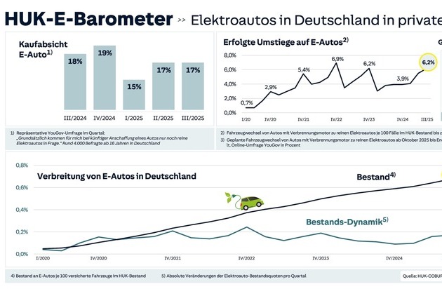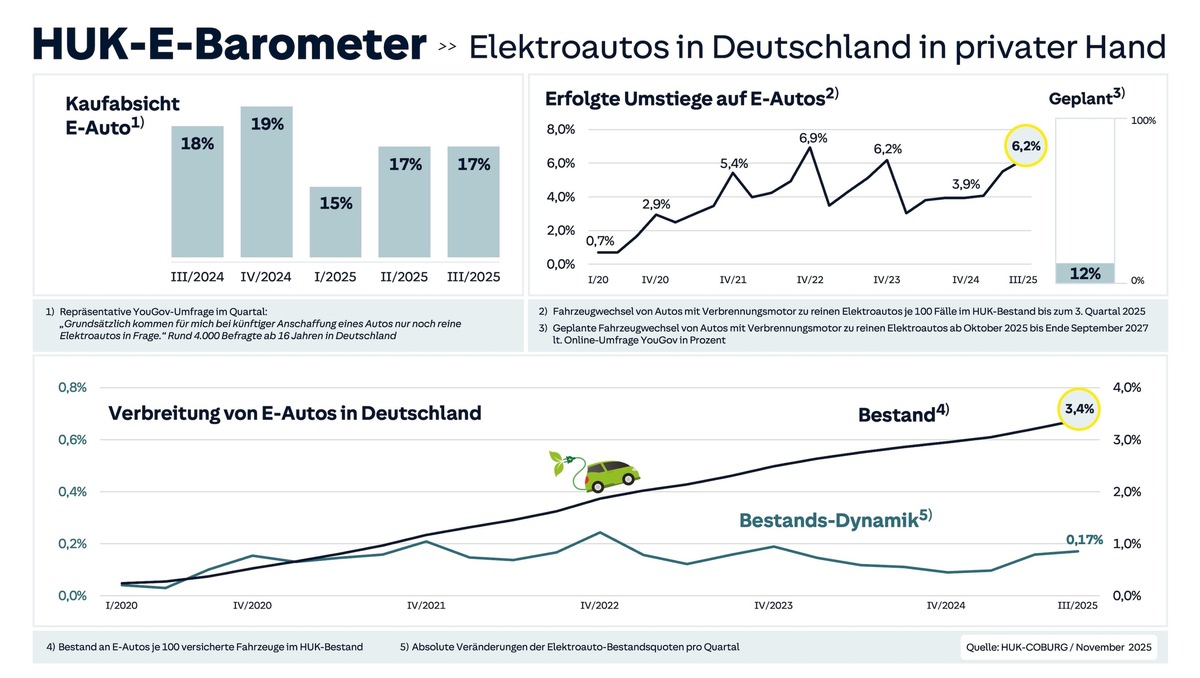 Die Häufigkeit, mit der die Deutschen privat von Autos mit Verbrennungsmotor zu reinen Elektroautos wechseln, hat im dritten Quartal 2025 den höchsten Wert seit zwei Jahren erreicht. Laut HUK-E-Barometer fand der Umstieg bei 6,2 Prozent aller privaten Fahrzeugwechsel (Vorquartal 5,5 %) statt. Die Umstiegshäufigkeit hat sich damit seit dem Tiefpunkt Anfang 2024, also nach Wegfall der staatlichen E-Kaufprämie, mehr als verdoppelt. Am begehrtesten waren im bisherigen Jahresverlauf der Skoda Elroq bei Neuwagen und der VW ID.3 bei Gebrauchten. Eine für 2026 neu konzipierte staatliche E-Auto-Förderung könnte zudem Wirkung entfalten: Werden hiermit auch gebrauchte und damit erschwinglichere E-Autos gefördert, sollte dies insbesondere die Altersgruppe unter 40 Jahren aktivieren. Denn hier sind rein elektrisch betriebene Fahrzeuge laut HUK-E-Barometer weit beliebter als unter Älteren. Bisher aber waren - vermutlich wegen hoher Preise - die Umstiege auf E-Autos in dieser jüngeren Altersgruppe vergleichsweise selten. Auch Hybrid-Fahrzeuge spielen eine Rolle für das künftige Umstiegstempo. Jedoch: Nur bei Fahrern von Plug-In-Hybriden gibt es bislang signifikant mehr spätere Wechsel zu reinen E-Autos.