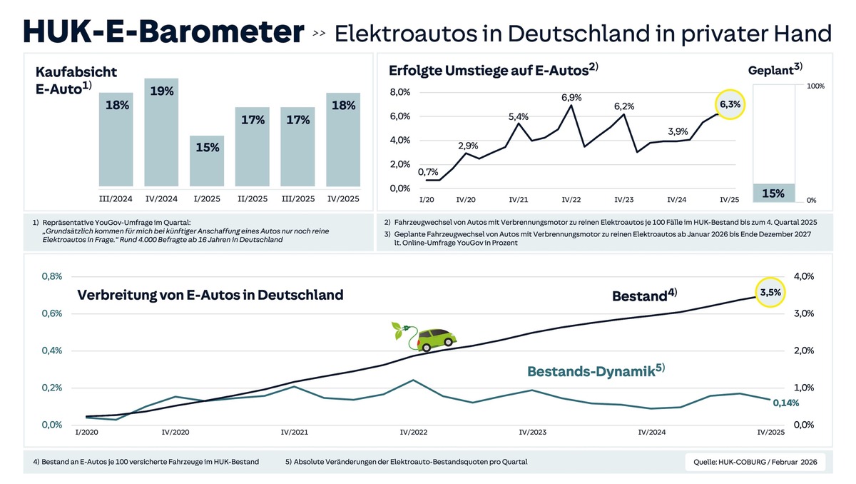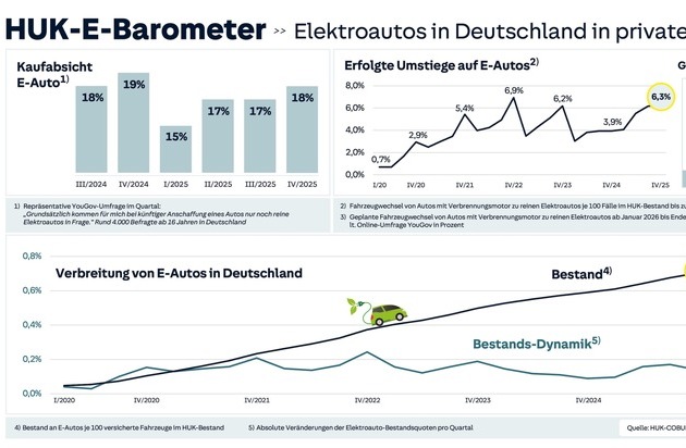 Im vierten Quartal 2025 wurde in Deutschland die höchste Umstiegsquote von Verbrenner- auf Elektroautos bei Privatpersonen seit drei Jahren erreicht. Laut HUK-E-Barometer war dies bei 6,3 Prozent aller privaten Fahrzeugwechsel der Fall. Damit ist die Umstiegsquote in allen Quartalen 2025 immer weiter gestiegen. Für das Gesamtjahr 2025 ergibt sich daraus insgesamt die höchste bislang gemessene jährliche Umstiegsquote (5,5 %). Und auch die weiteren Planungen der Privathaushalte gehen in die gleiche Richtung: 15 Prozent derjenigen, die in den kommenden zwei Jahren einen privaten Fahrzeugwechsel vornehmen wollen, fassen aktuell einen Umstieg auf einen rein elektrischen Antrieb ins Auge.