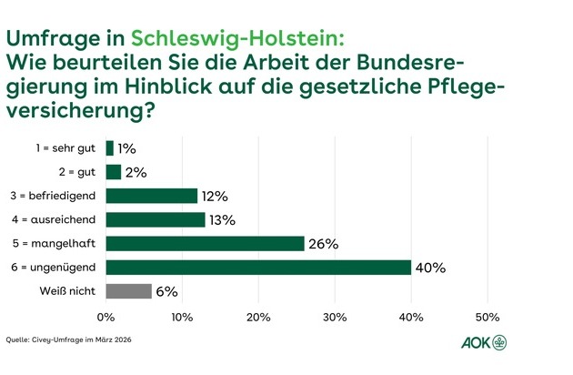 Die soziale Pflegeversicherung steckt in der Krise: Hohe Beitragssätze, steigende Eigenanteile im Heim und strukturelle Defizite bei Versorgungsangeboten. All das bereitet auch den Menschen in Schleswig-Holstein offenbar erhebliche Sorgen. Das ergab jetzt eine repräsentative Civey-Umfrage zum Thema Pflege der AOK NordWest. Auf die Frage, mit welcher Schulnote die Befragten "die Arbeit der Bundesregierung im Hinblick auf die gesetzliche soziale Pflegeversicherung" beurteilen würden, vergaben 40 Prozent der Befragten in Schleswig-Holstein ein "Ungenügend" und damit die Note 6. 26 Prozent vergaben die Note 5, 13 Prozent sagen 'ausreichend' (Note 4). "Die Ergebnisse der Umfrage machen deutlich, dass der seit langem ungelöste Reformbedarf in der Pflege die Menschen offenbar stark verunsichert. Deshalb ist die Bundesregierung gefordert, auch diesen Sozialversicherungszweig finanziell zu stabilisieren, damit das Vertrauen der Menschen in die Zukunft der Sozialen Pflegeversicherung (SPV) nicht verloren geht. Der Handlungsbedarf ist gewaltig", sagt AOK-Vorstandschef Tom Ackermann. Für die SPV liegen bisher ernüchternde Ergebnisse der Bund-Länder-Arbeitsgruppe 'Zukunftspakt Pflege' vor.