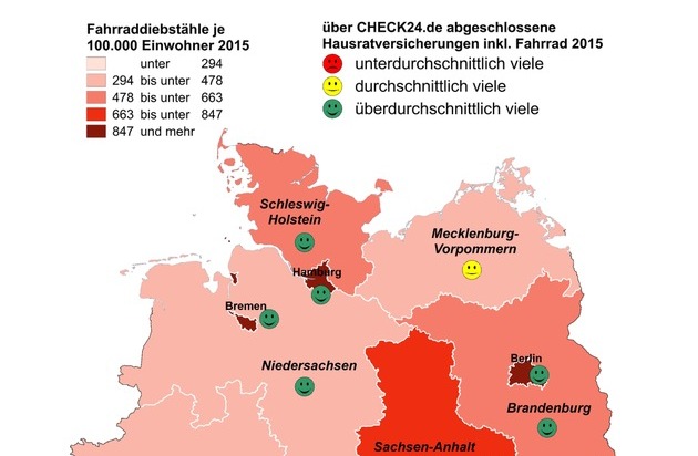 *)Betrachtet wurden alle 2015 über CHECK24.de abgeschlossenen Hausratversicherungen inklusive Absicherung gegen Fahrraddiebstahl nach Wohnort des Versicherungsnehmers und Versicherungsbeitrag. Zusätzliche Betrachtung des Verhältnisses der abgeschlossenen Hausratversicherungen zu den Einwohnern je Bundesland/Stadt: Index <0,9 = unterdurchschnittlich viele Hausratversicherungen inkl. Fahrraddiebstahl abgeschlossen, Index 0,9-1,1 = durchschnittlich viele Hausratversicherungen inkl. Fahrraddiebstahl abgeschlossen, Index >1,1 = überdurchschnittlich viele Hausratversicherungen inkl. Fahrraddiebstahl abgeschlossen; die Daten wurden verglichen mit der Anzahl der Fahrraddiebstähle 2015 laut Polizeilicher Kriminalstatistik 2015. **)Quelle: Bundeskriminalamt, Polizeiliche Kriminalstatistik 2015: http://ots.de/j5wdd [06.07.2016]