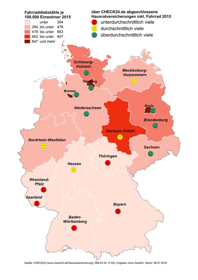 *)Betrachtet wurden alle 2015 über CHECK24.de abgeschlossenen Hausratversicherungen inklusive Absicherung gegen Fahrraddiebstahl nach Wohnort des Versicherungsnehmers und Versicherungsbeitrag. Zusätzliche Betrachtung des Verhältnisses der abgeschlossenen Hausratversicherungen zu den Einwohnern je Bundesland/Stadt: Index <0,9 = unterdurchschnittlich viele Hausratversicherungen inkl. Fahrraddiebstahl abgeschlossen, Index 0,9-1,1 = durchschnittlich viele Hausratversicherungen inkl. Fahrraddiebstahl abgeschlossen, Index >1,1 = überdurchschnittlich viele Hausratversicherungen inkl. Fahrraddiebstahl abgeschlossen; die Daten wurden verglichen mit der Anzahl der Fahrraddiebstähle 2015 laut Polizeilicher Kriminalstatistik 2015. **)Quelle: Bundeskriminalamt, Polizeiliche Kriminalstatistik 2015: http://ots.de/j5wdd [06.07.2016]
