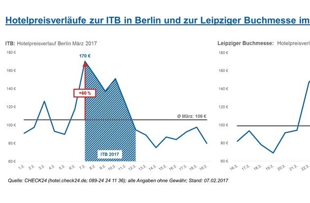 - Preiserhöhungen im Schnitt um 71 ProzentDie Internationale Tourismus-Börse (ITB) in Berlin und die Leipziger Buchmesse ziehen im März 2017 hunderttausende Besucher an.* Dadurch steigen die Preise für Hotelübernachtungen in den beiden Städten deutlich an: Besucher der ITB (08. bis 12. März) zahlen in Messenähe für ein Zimmer gleicher Kategorie im identischen Hotel in der Spitze viermal so viel wie eine Woche später.** Zur Leipziger Buchmesse (23. bis 26. März) sind die Hotelkapazitäten schon jetzt knapp: Zum Betrachtungszeitpunkt gab es im CHECK24-Hotelvergleich nur noch in zwei messenahen Unterkünften freie Zimmer mit Preisaufschlägen von bis zu 385 Prozent.