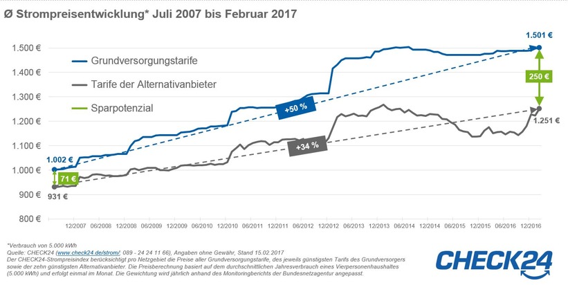 Durch höhere EEG-Umlage und Netzentgelte sowie steigende Spotmarktpreise an der Strombörse werden auch die Tarife der Alternativanbieter teurer. 5.000 KWh Strom kosten aktuell (Stand Februar 2017) im Schnitt 1.251 Euro. Dennoch wird ein Stromanbieterwechsel immer lukrativer: Durch einen Wechsel im Februar 2017 spart ein Vierpersonenhaushalt im Schnitt 250 Euro pro Jahr. Vor zehn Jahren waren es nur 71 Euro.