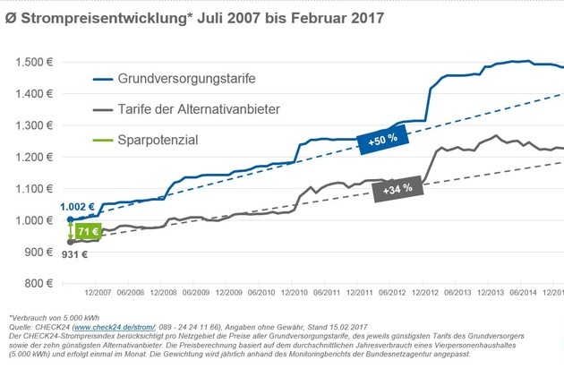 Durch höhere EEG-Umlage und Netzentgelte sowie steigende Spotmarktpreise an der Strombörse werden auch die Tarife der Alternativanbieter teurer. 5.000 KWh Strom kosten aktuell (Stand Februar 2017) im Schnitt 1.251 Euro. Dennoch wird ein Stromanbieterwechsel immer lukrativer: Durch einen Wechsel im Februar 2017 spart ein Vierpersonenhaushalt im Schnitt 250 Euro pro Jahr. Vor zehn Jahren waren es nur 71 Euro.