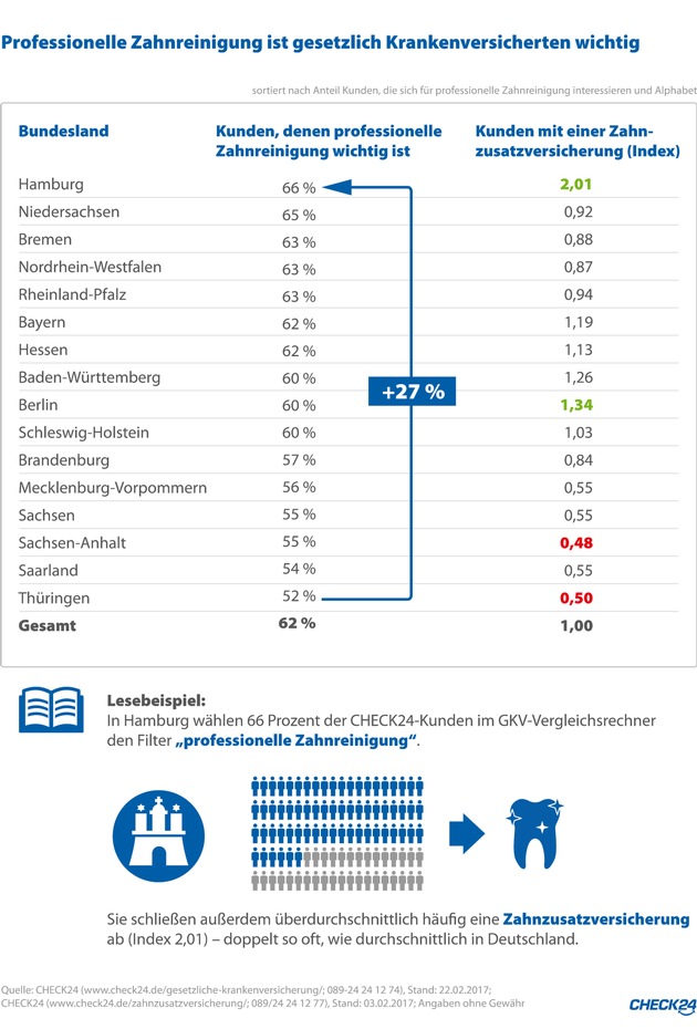 - Hamburger schließen am häufigsten eine Zahnzusatzversicherung abVerbrauchern ist in der Gesetzliche Krankenversicherung (GKV) neben dem Beitrag vor allem die professionelle Zahnreinigung wichtig. 62 Prozent der CHECK24-Kunden wählten diesen Filter im GKV-Vergleichsrechner aus.*)