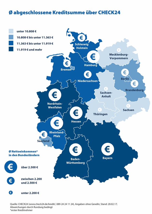 *)Grundlage: alle 2016 über CHECK24.de abgeschlossenen Kredite; Nettoeinkommen nach Bundesländern und Ost-West bezieht sich jeweils nur auf den ersten Kreditnehmer. Weitere Infos zur Methodik und den Ergebnissen unter http://ots.de/mvCac und https://www.check24.de/kredit/publikationen/kreditanalyse/