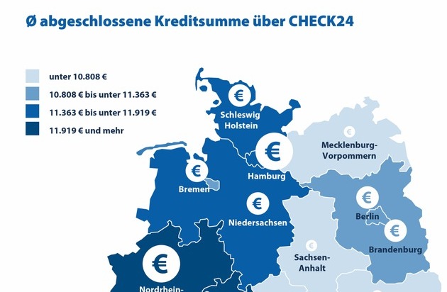 - Paare bekommen bessere Zinskonditionen als EinzelpersonenCHECK24-Kunden aus Baden-Württemberg schließen bundesweit die höchsten Kredite ab. Im Schnitt leihen sie sich 12.475 Euro von der Bank - 22 Prozent bzw. 2.223 Euro mehr als Verbraucher aus Sachsen (Ø 10.252 Euro).*)