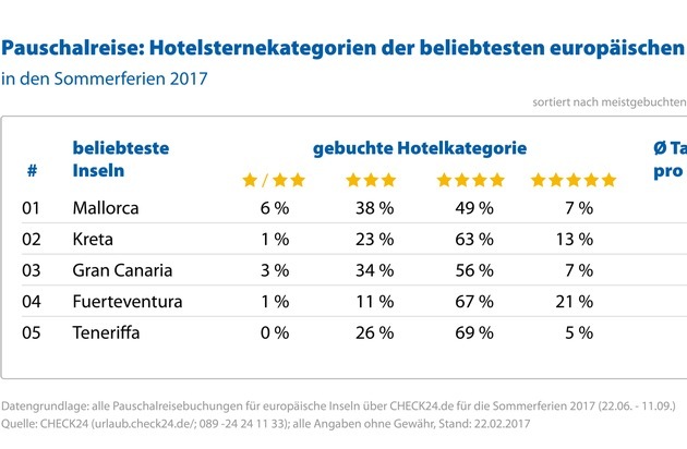 *Betrachtet wurden alle Pauschalreisebuchungen im Januar 2017 über CHECK24.de für einen Aufenthalt auf einer europäischen Insel in den Sommerferien 2017 (22.06. - 11.09.)
