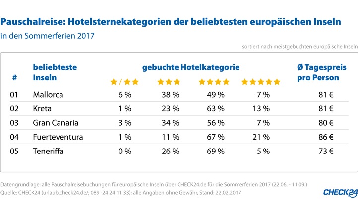 *Betrachtet wurden alle Pauschalreisebuchungen im Januar 2017 über CHECK24.de für einen Aufenthalt auf einer europäischen Insel in den Sommerferien 2017 (22.06. - 11.09.)