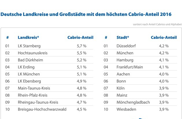 Starnberg ist Cabrio-Hochburg, Düsseldorf und München im Großstadtranking vorne